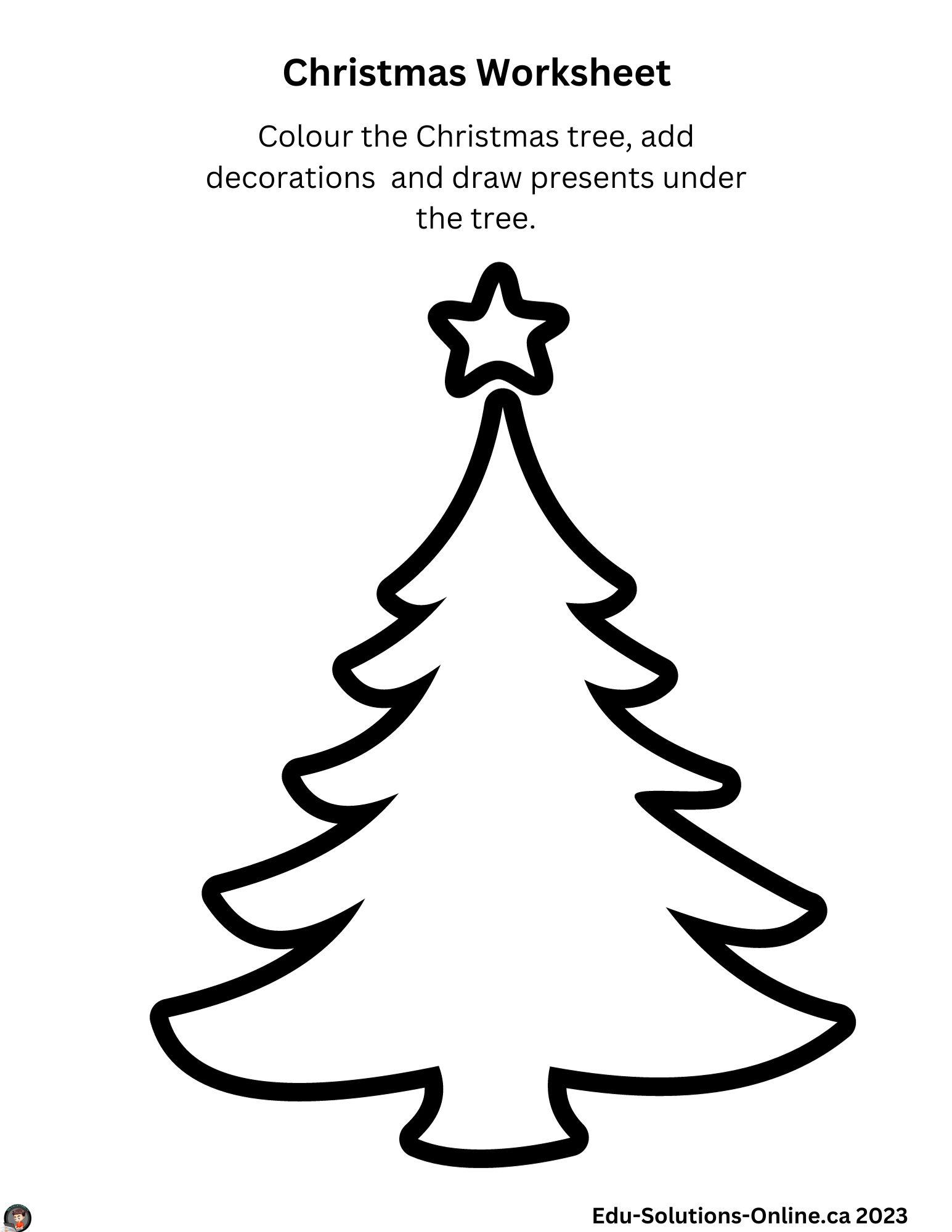 Colour the Christmas tree, add decorations and draw presents under the tree.